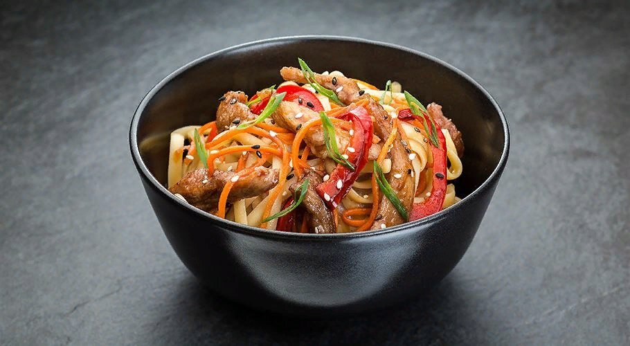 Подать очень вкусную лапшу удон с курицей и овощами к столу в горячем виде.