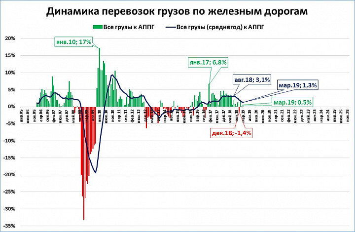 Тем не менее, март 2019 года стал по объёмам перевозок лучшим месяцем с 2008 года: Среднемесячные объёмы перевозок стабилизировались на уровне 107+ млн. тонн с августа 2018 года.