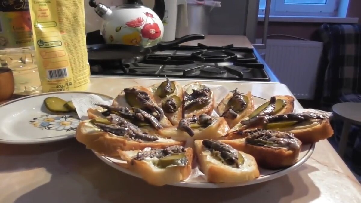 Всем привет! Сегодня расскажу про приготовление быстрых бутербродов из шпротов и малосольных огурчиков. Такие бутерброды очень любят в нашей семье! Если вам понравится рецепт ставьте лайк и подписывайтесь на канал, впереди много интересного! Нам понадобится: Шпроты. Батон. Малосольные огурчики. Майонез. Зелень. И так первым делом кусочки батона кладем на сковороду смазанную растительным маслом. Обжариваем с каждой стороны. Сильно не обжариваем, слегка, чтобы получились сухарики. Берем малосольный огурчик, нарезаем колечками. Открываем шпроты. Убираем сухарики со сковороды, теперь на тарелочку с салфеткой кладем их. Нужно добавить на каждый кусочек батона майонеза, совсем немного и хорошо размазать по кусочку батона.Кладем сначала огурчик, потом одну шпротинку. И так нужно сделать с каждым кусочком батона. Теперь я беру вилку и придавливаю шпротинку, чтобы кусочек впитал масло и так вряд ли шпротинка упадет с бутерброда. Посыпаем поверх зеленью. Это может быть укроп, петрушка мелко наре