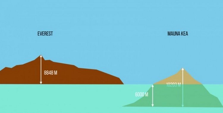 - Каждому школьнику известно, что высочайшей в мире вершиной является Джомолунгма или Эверест. Но есть на планете и гора намного выше. Это гавайский вулкан Мауна-Кеа, который возвышается над уровнем океана всего на 4205 метров, но вот от своего основания на дне океана он взгромоздился на 10203 метра.