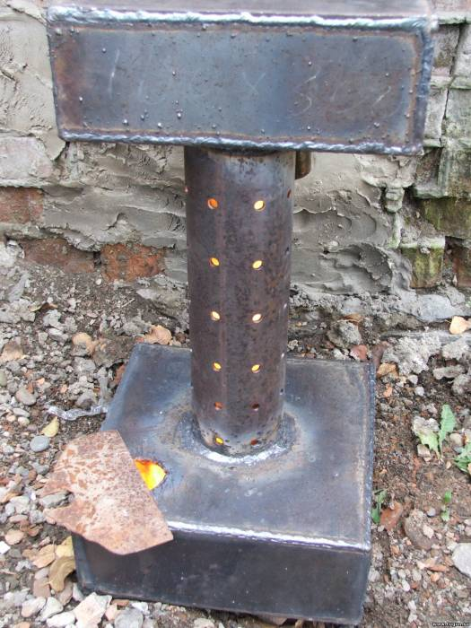 300х300х115 листовой металл 4 мм. В верхней крышке отверстие 60 мм. для залива масла и розжига. Отверстие закрывается пластиной. Степень перекрытия определяет мощность.