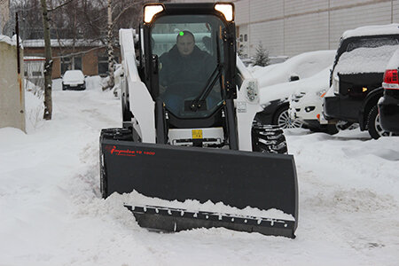 Однако с уборкой снега на территории отлично справляются и более легкие широкоуниверсальные колесные погрузчики Bobcat S175, S530, S570. Коммунальный отвал шириной 1800 мм идеально подходит под эти модели погрузчиков. Каждый мини-погрузчик Bobcat объединяет модульная система управления поворотом отвала. На новые машины Bobcat рекомендуется устанавливать отвал с гидравлическим поворотом. Солидные заслуженные погрузчики S175, S150, все еще находящиеся в строю, наиболее рационально комплектовать поворотными отвалами с механическим приводом. В дальнейшем, такой отвал можно легко модернизировать, установив систему дистанционного поворота скребка в штатные крепления.