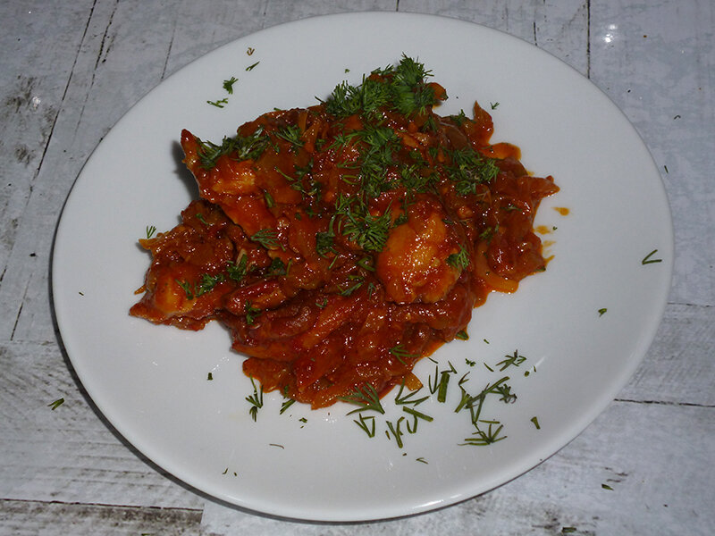 Я не большая поклонница различных заправок. Огурцы и помидоры маринованные люблю. Икру кабачковую, грибочки тоже принимаю в виде еды. А вот лечо… Но бабушка старательно готовит каждое лето. Сказать, что не едим, язык не поворачивается. Выкинуть? Это непозволительный шаг, особенно, если учитывать, сколько труда в это вложено. Долго думала, как использовать «богатство». Решила провести кулинарный эксперимент. И оказался он весьма удачным! Время приготовления – 40 минут. Количество порций – 1. Ингредиенты Способ приготовления Касательно состава лечо скажу, что состоит оно из помидор, перцев, моркови и масла. Уксус в этом лечо не используется, что очень важно. Но хранить его нужно исключительно в холодильнике. 1. С куриного бедра снимаем мясо и нарезаем. Я делала полосками размером с палец. Затем приправляем его специями (я использовала только соль). 2. Шинкуем лук. 3. Лук обжариваем в масле с добавлением паприки (люблю эту специю), кориандра и щепотки соли. Жарим около 5 минут на медленно