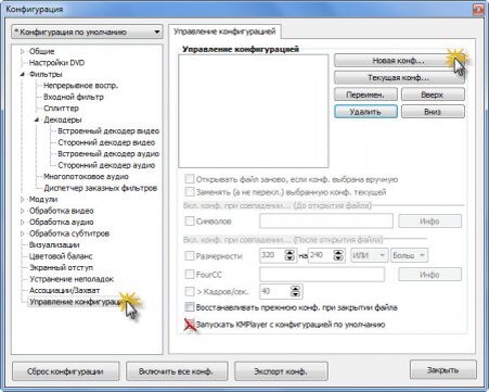 Настройка аппаратного ускорения декодирования видео (DXVA и CUDA) в KMPlayer.Запускаем «KMP». Открываем настройки (нажать клавишу «F2» или «щелчек правой кнопкой мыши по главному окну программы => Настройки => Конфигурация»). Перейдем к «Управления конфигурацией» и создадим новую конфигурацию (профиль).
