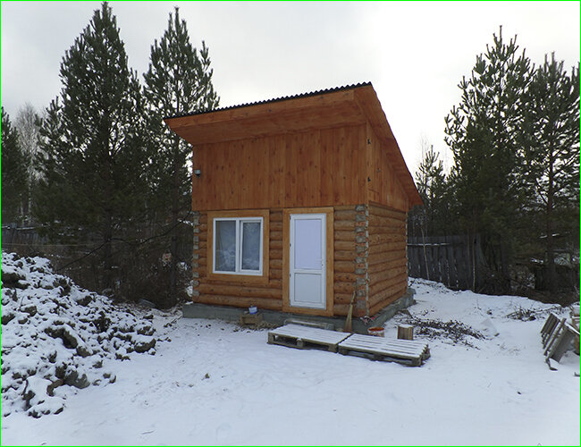 Основной сруб из рубленого бревна, диаметр которых составляет от 20 до 24 см. По наружным углам, размер бани 4х4 метра.