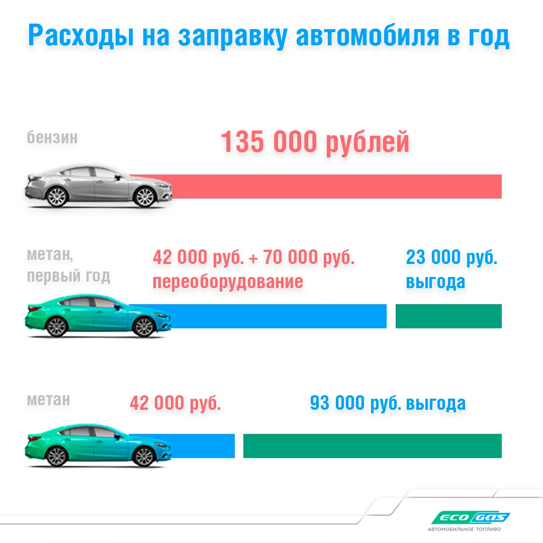 Природный газ (метан) уверенно продвигается в лидеры рынка моторного топлива благодаря своей экономичности. Тенденция перехода на «голубое топливо» уже достигла пика в США, Китае, ОАЭ, Европе и стремительно развилась в России. Во всем мире наша страна обладает самыми богатыми запасами данного топлива. Причиной такой популярности метана является не столько его экологичность, сколько привлекательная цена. Стоимость заправки автомобиля природным газом в 2-3 раза ниже по сравнению с бензином. В среднем стоимость метана в России равна 16 рублей. На основе этих данных попробуем сравнить расход метана с расходом бензина. Чтобы произвести такие расчеты, необходимо знать теплотворную способность топлива. Для метана она равна 13175 ккал/кг, а для бензина - 10572 ккал/кг. Вычислим энергию 1 кубического метра каждого из этих видов топлива. Метан имеет плотность 0,71 кг на куб. м, соответственно его энергия равна 9354 ккал на куб. м. Энергия бензина с плотностью 0,73 кг/л составляет 7718 ккал