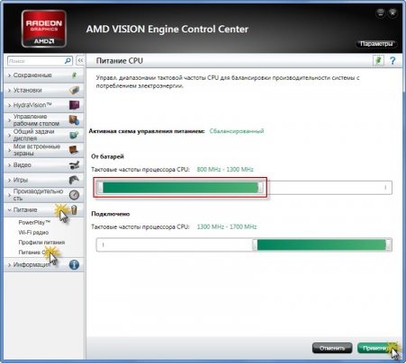 Регулировка частот процессора. Можно искусственно понизить (ограничить) частоту процессора при работе от батареи. Так как DXVA практически не загружает процессор, а «FFDshow» существенно понижает нагрузку на него при воспроизведении обычного (не HD) видео, то теперь при понижении частоты процессора видео уже не будет тормозить, а срок работы от аккумулятора увеличится. ВАЖНО: помните, при понижении частоты любые операции на ноутбуке будут производится несколько медленнее! Если вы планируете не только смотреть фильмы, но и, например, активно работать в Интернете или создавать презентации в PowerPoint, то вам стоит задуматься о рациональности подобного шага! Я не случайно рекомендую использовать «Catalist Control Center», так как он в случае необходимости позволяет быстро изменить частоту. Также можно создать или настроить специальный план электропитания.