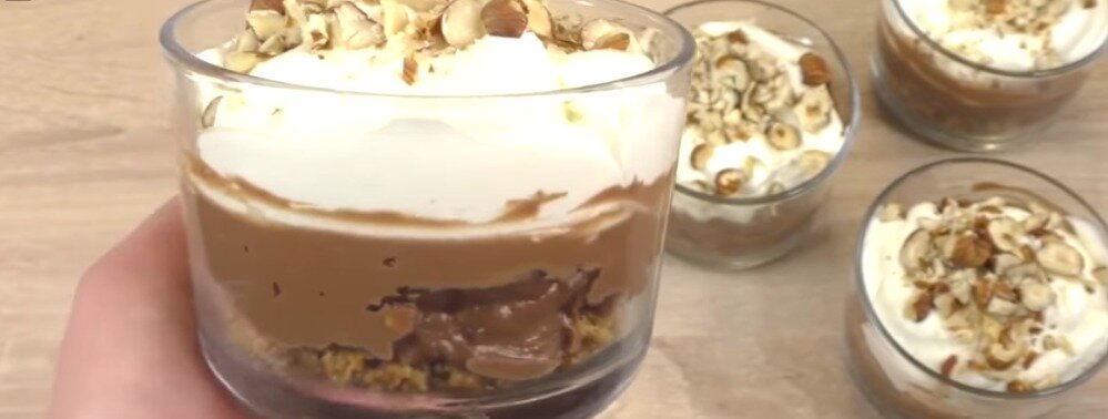 Этапы приготовления 1. Размельчаем печеньки и заливаем их растопленным сливочным маслом. Хорошенько перемешиваем. 2. Полученную массу поровну распределяем и плотно утрамбовываем в стаканчики. Ставим их в холодильник. 3. В это время мы замешиваем миксером маскарпоне с нутелой. Далее высыпаем туда орехи и продолжаем замешивать миксером. 4. Достаем наши стаканчики из холодильника и выкладываем в них поровну полученный шоколадно-ореховый мусс. 5. Последним слоем выкладываем взбитые сливки. 6. Сверху можно посыпать орешками. Ставим на полчаса в холодильник, а после угощаем наших родных и друзей. Приятного аппетита!