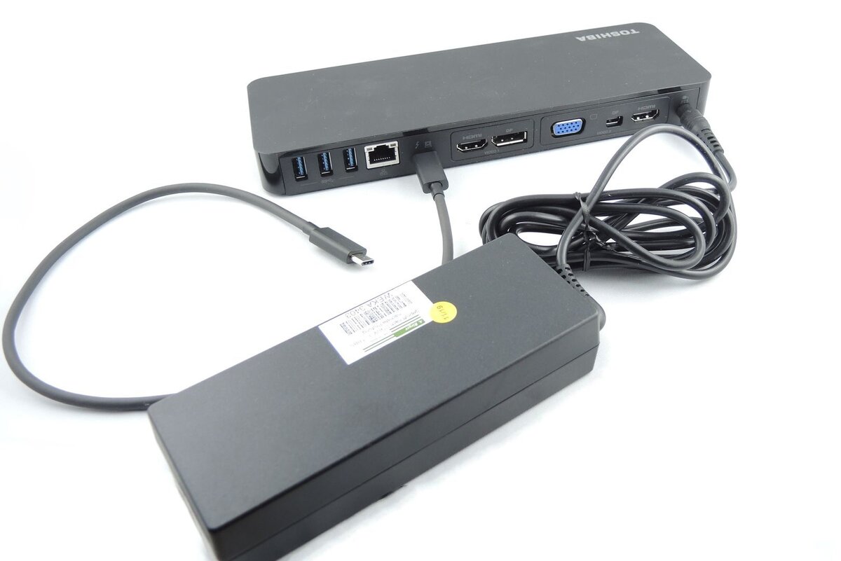 Сегодня на моем столе док-станция Toshiba Thunderbolt 3. Для меня как любителя периферии - абсолютная мечта, и сейчас я вам о ней расскажу. Что поражает при распаковке - вес. Toshiba Thunderbolt 3 Docking весит всего 380 гр. Благодаря прорезиненным выступам в нижней части, устройство не скользит по любой поверхности и говорит. Только размер адаптера питания Thunderbolt 3 немного пугает. Однако замечу, что устройство легко прячется под офисным столом и предлагает хороший функционал, например можно заряжать ноутбук параллельно через Thunderbolt 3 с USB-C от Toshiba. Станция подключается через USB-C к ноутбуку. Порт USB на ноутбуке не обеспечивает достаточно энергии, чтобы использовать Thunderbol 3 без адаптера питания, но только в том случае когда необходимо реализовать множество подключений. Список разъемов Toshiba Thunderbolt 3 : Рабочий стол становится мощным устройством для работы, благодаря комбинации всех общих портов, Thunderbolt 3, двух выходов HDMI®, к которым можно подкл