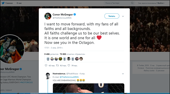 Намедни ирландский борец UFC Конор Макгрегор объявил о окончании карьеры в смешанных единоборствах. Об данном спортсмен заявил на собственной страничке в «Твиттере». Ирландский и фаворит UFC Конор Макгрегор объявил о возобновлении спортивной карьеры сквозь 9 дней впоследствии её окончания. Об данном он написал в твиттере. Я пытаюсь ехать вперёд совместно со собственными своими фанатами из различных религий и уголков планетки. Все исповедания кидают нам вызов замерзнуть наилучшей версией самих себя. Это раз мир, и он для всех. Увидимся в октагоне [ринг].