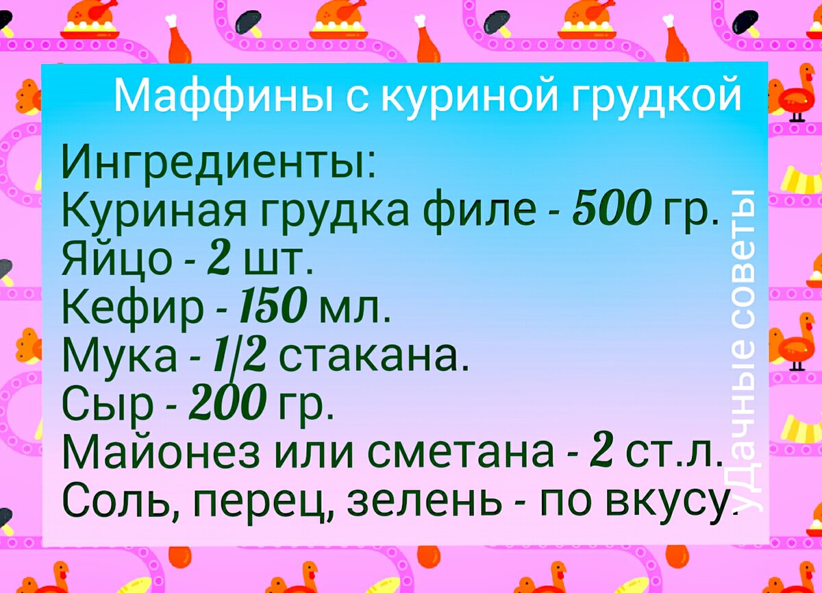 Куриную грудку я люблю. Тем более, в таких простых и необычных рецептах, как этот. Больше всего радует, что мои дети, которые к куриной грудке равнодушны, такие маффины очень хорошо едят. Итак, все просто. Грудку отвариваем в подсоленной воде и мелко режем. Добавляем к измельчëнному мясу кефир, пару яиц и полстакана муки. Стакан мерный берем обычный, 250 гр. Сыр натираем на средней терке, добавляем в тесто. Так же добавляем пару столовых ложек майонеза или сметаны. Солим и перчим по собственному вкусу. По желанию в тесто можно добавить измельченную зелень. Раскладываем тесто в подготовленные формочки для маффинов. Выпекаем в предварительно разогретой до 180 градусов духовке примерно 20 минут. Как только кексы аппетитно зарумянятся - куриные маффины готовы. Даём немного остыть и подаём к столу. Самое интересное, что в остывшем виде кексы еще вкуснее. Приятного аппетита! И не забываем про приятный бонус в закреплённом рецепте канала! 🤗