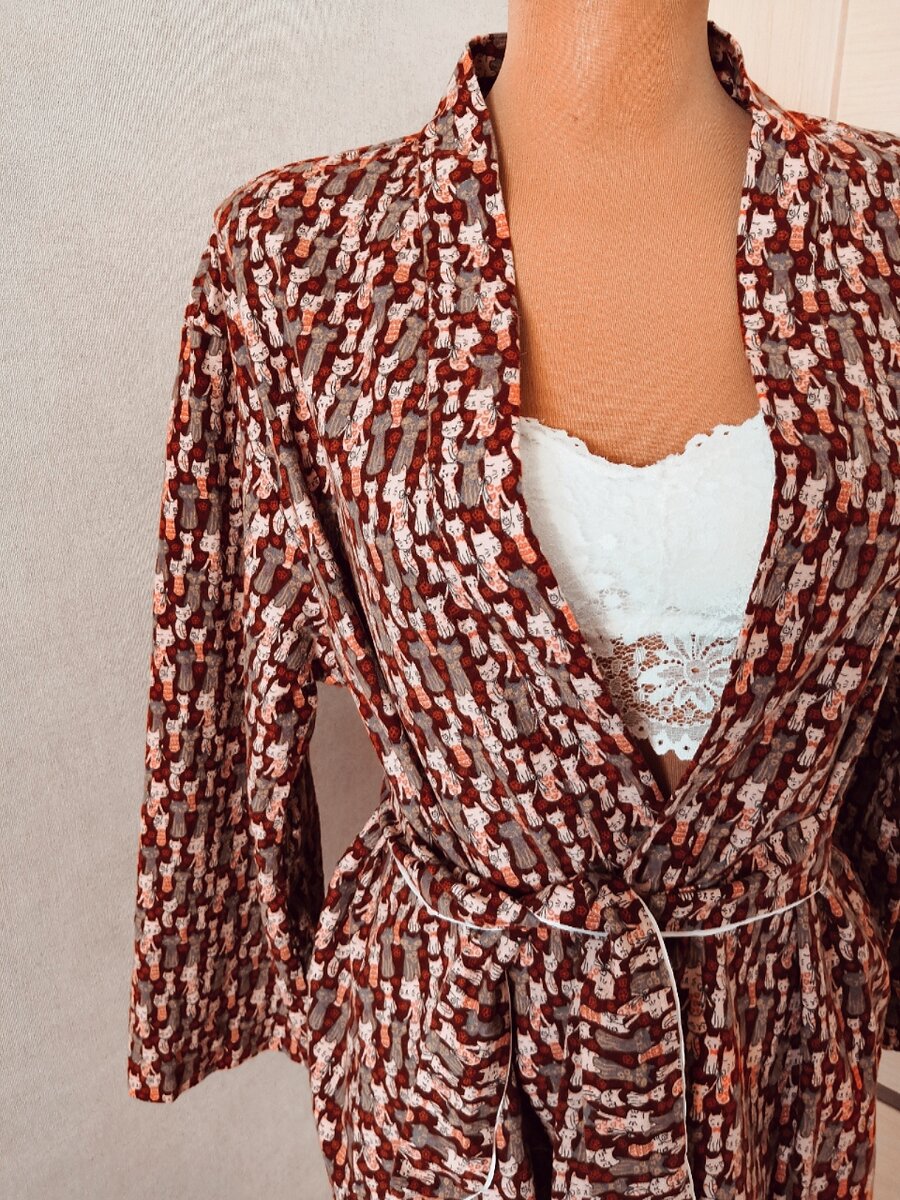 Уж лето на дворе... И пора бы про пляжные туники вещать, да вискозу освещать... Но никогда не поздно рассказать о новенькой сшитой фланелевой пижаме, так ведь?! Тем более, она заслуживает внимания! Любителям кошачьих, приготовить свои нежные сердца! Уж История этой пижамы уходит своими корнями далеко в осень, в тот день я буквально влюбилась в бордовую фланельку с разнообразными смешными котами! Впереди зима сулила свой скорейший приход, поэтому раздумывала я не очень долго, пару секунд. Ткани я отсыпала себе настолько щедро, что остался внушительных размеров ломоть, который я, недолго думая, превратила в элегантные теплые шорты. Таким образом, образовался приятный бонус, «3 в 1». Верхняя часть сшита в форме простой накидки, так мне «увиделось»; рубашкой сделаю другую какую-нибудь пижамку. Скажу честно, такая деталь гардероба у меня впервые, это и не халат, и не рубашка, хотя по длине тянет на прилично неприличный халатик. Удобная вещь, скажу я вам! Таким образом, нехитрыми математиче