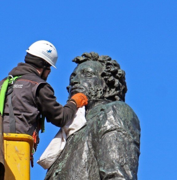 Сотрудники Музея городской скульптуры открыли сезон планового ухода за памятниками Петербурга. Первым сотрудники Музея помыли памятник Александру Сергеевичу Пушкину на площади Искусств в Центральном районе.