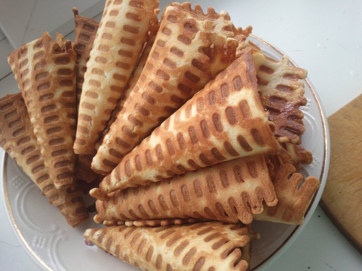 Эти вкусные вафельки, просто обожает моя семья. Рецепт довольно прост, да и выпекание не доставляет особых неудобств, а результат - довольные и сытые домочадцы. Для приготовления вкусняшек нам потребуется: 5 яиц; 250г. маргарина; 1 стакан сахара; 1.5 - 2 стакана муки. Итак, необходимо растопить маргарин, немного остудить, добавить яйца, сахар и постепенно всыпать муку. Тесто должно получиться как на торт. Не жидкое и не очень густое. Тем временем можно уже включить вафельницу и перейти к выпеканию наших вафелек. Необходимо зачерпнуть столовой ложкой тесто и выложить в вафельницу, закрыть, подождать пока будущая вафелька станет золотистого цвета, аккуратно вытащить с помощью ножа и скрутить в трубочку. Готовые вафли можно наполнить вареной сгущенкой. Приятного аппетита!