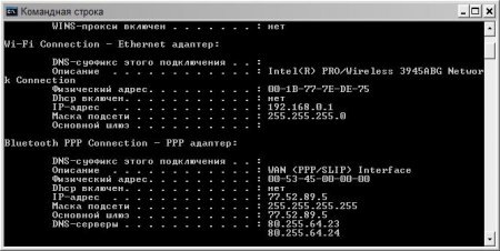 Теперь запустим Командную строку (сделать это можно через меню Пуск или введя в окошко Выполнить команду cmd). Вводим команду ipconfig /all и нажимаем Enter