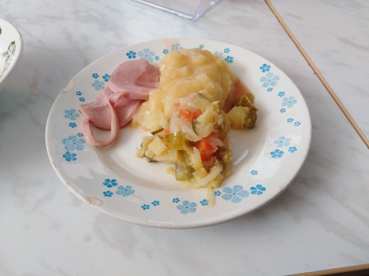 Всем привет, неожиданно для себя я начал делать этот обзор. Перед глазами своими вы лицезреете "Картофельное пюре", с салатом из... из... Вообщем салат, а также остатки колбасы. Расмотрим же поподробнее это блюдо. Во первых видим, что картофельное пюре полито подливкой "Уаля-ДастишФантастиш", придающая пюрехе аппетитный вид и вкус (со вкусом не уверен). Также подлива немного смягчает пюрешочку, и её можно есть даже без зубов. Однозначно плюс. Переходим к салату. Сделан он из отборнейших свежайших овощей, к сожалению без мазика(((. Хотя я всё равно бы не ел. Однако разнообразие и обилие овощей придает ей яркость и изысканность. Ну и наконец - прелестнейшая натуральнейшая колбаса, прямо из Чехословакии. Говорить нечего, так-как вы и сами видите её идеальность по всем параметрам. Но было бы лучше если бы она была хотя бы целая. Вот мы и закончили с этим блюдом. Надеемся, что вам понравился обзор.