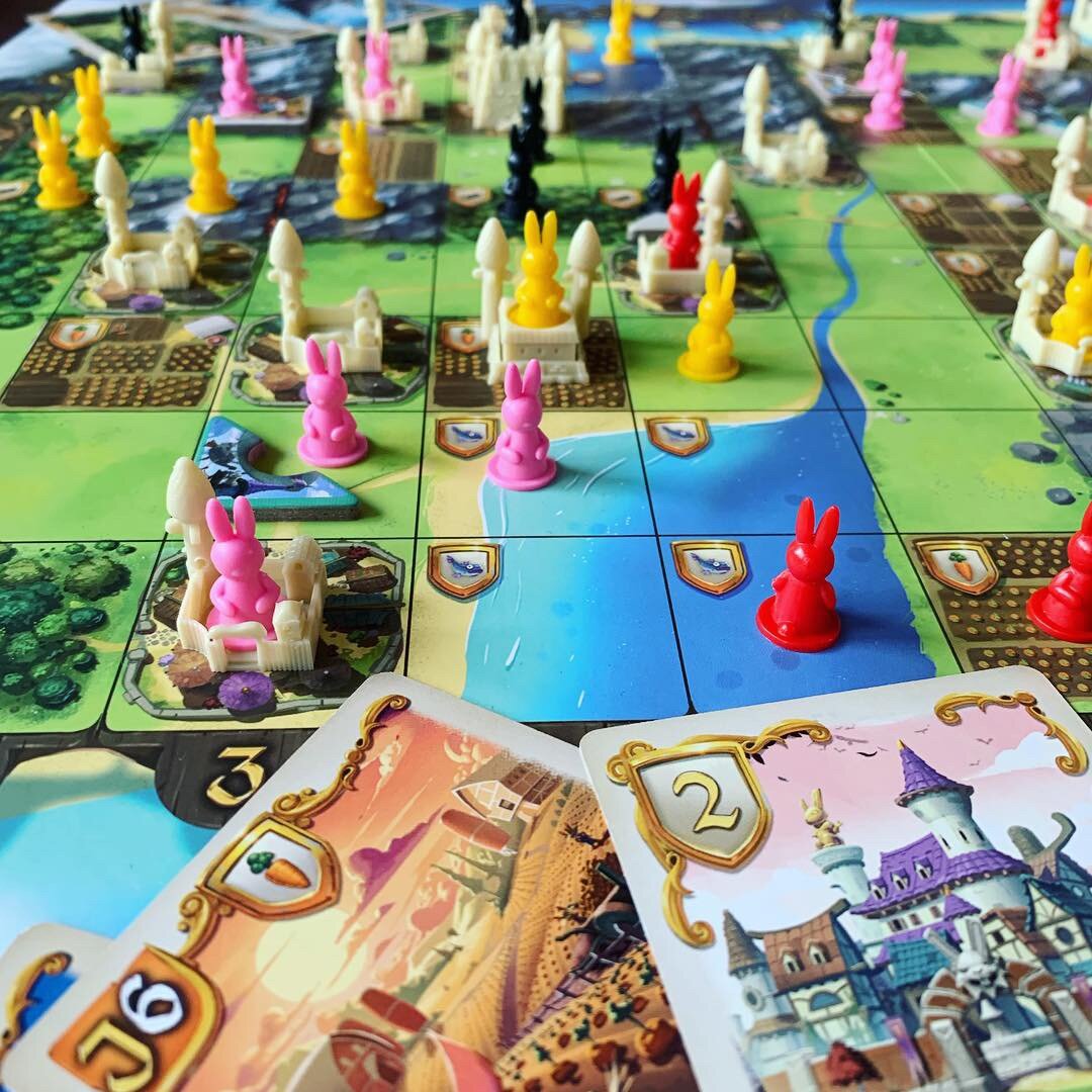Мы влюбились в эту игру с первого взгляда, и пришло время познакомить вас с этим очаровательным шедевром от создателя Magic the Gathering Ричарда Гарфилда. Итак, перед вами Bunny Kingdom. — Тип: драфт, семейная стратегия Сложность: ⭐️⭐️⭐️ Кол-во игроков: 2-4 Время: 45+ минут — Исследуй кроличий мир, полный ресурсов, и создай самое многофункциональное королевство! — Цель игры: заработать как можно больше победных морковок и стать морковным королём😊 — В этой игре вы должны захватывать клетки земель, на которых производятся различные ресурсы, такие как морковь, древесина или рыба, а также расширять свои владения, или создать много маленьких феодов, которые будут приносить вам дополнительные очки. — Сложность заключается в том, что из 10 карт (или 12 при игре втроём) вам нужно выбрать 2, по вашему мнению, наилучшие, а остальные передать сопернику. Таким образом вам придётся принимать сложные решения. •В картах может попасться как карта земли, где можно расположить вашего кролика, так и ка