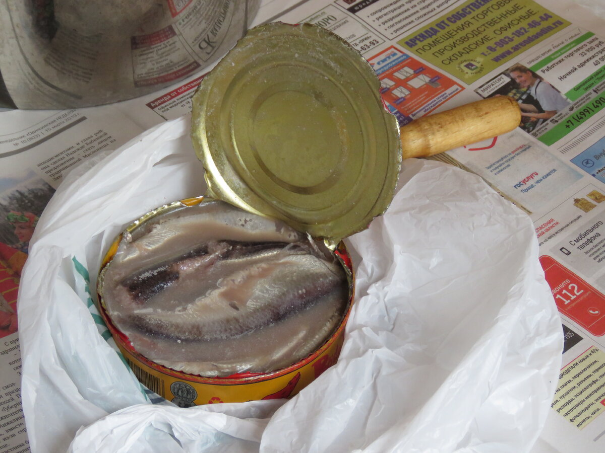 Что такое сюрстрёмминг? Это квашеная селедка, с очень резким запахом, вот прямо очень-очень, просто запах разлагающегося трупа. Банка с сюрстрёммингом вздутая, но это нормально, просто селедка продолжает бродить даже после консервации, там скапливаются зловонные газы, которые вырываются наружу, как только вы проткнете банку, поэтому открывайте ее аккуратно, мы открывали ее через пакет.