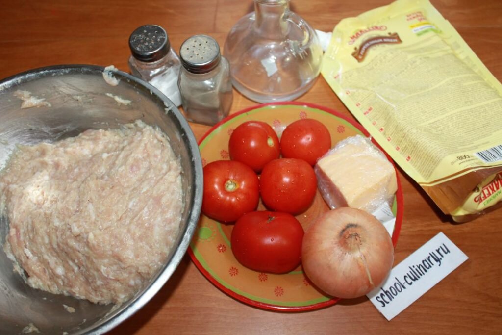 Оригинальная закуска или горячее блюдо – стожки с помидорами и сыром. Симпатичные котлетки из фарша готовятся очень быстро. Достаточно лишь сформировать колобки из смеси куриного и свиного наполнителя, выложить их на противень и украсить кружочками помидоров и сырными кусочками. Даже неопытный кулинар сможет справиться с таким простым и понятным блюдом. Ингредиенты: Приготовление Фарш берем охлажденный из смеси куриного и свиного мяса. Он после запекания останется очень сочным и нежным. Перекладываем его в миску, солим, приправляем специями по вкусу и отбиваем, чтобы держал форму. Для чего берем массу, бросаем ее в миску и так повторяем два-три раза. Помидоры небольшого размера ополаскиваем. Лук репчатый чистим и моем. Помидорки режем на кружочки толщиной 2-3 миллиметра. Лучок нарезаем тонкими колечками. Противень застилаем фольгой или пергаментной бумагой. Смазываем растительным маслом. Формируем котлетки и выкладываем их в противень на расстоянии одна от другой. Сверху на каждый ко