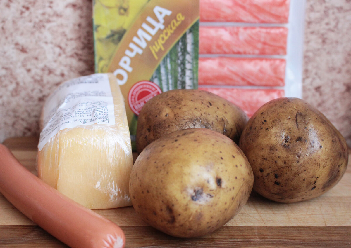 Любите картошечку? А с вкусными наполнителями? Есть такое известное заведение "Крошка картошка", и те кто там был, не забудут вкус сытной, картошки, сделанной с оригинальной подачей. Суть такой картошечки - это запекание в целом виде, а потом наполнение топпингом. Если вам понравится рецепт, то ставьте лайк и подписывайтесь на мой канал. Если не хотите потерять рецепт, то делитесь им в своих социальных сетях. Такую крошку картошку в домашних условиях легко приготовить, основное время от готовки идет на запекание картофеля в духовке, но вы при этом можете заниматься любыми другими делами. Итак, приступим. Ингредиенты Помытый сырой картофель в кожуре (Клубни лучше брать средние или большие, количество на ваше усмотрение, я брала 12); Крабовые палочки (у меня ушло пол пачки); Тертый сыр, 100 грамм; Вареная сосиска; Горчица две столовые ложка; Немного сливочного масла; Соль по вкусу. Приготовление 1. Каждый картофель оборачиваем фольгой. Укладываем на противень и отправляем в разогре