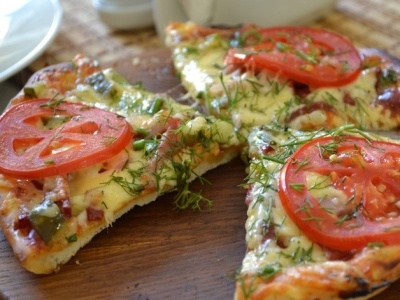- Всыпать быстрые дрожжи в воду, добавив немного муки. Вмесить масло и остаток муки. Порезать поперечно помидоры, настружить сыр. Порезать брусочками шпикачики и сервелатную колбасу, огурцы нарезать, как для салата. Раскатать пласт, подвернуть края. Уложить кружки помидоров, колбасные изделия и огурцы. Присыпать специями и сырной стружкой. Печь 25 минут.