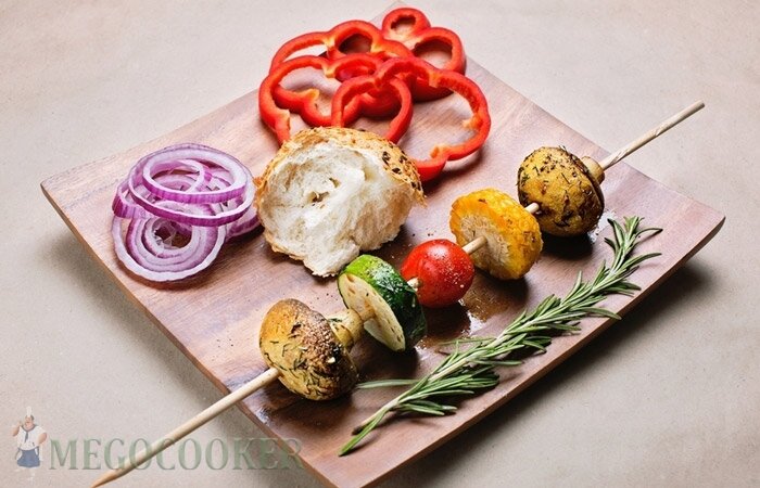 Что может быть лучше мясного шашлыка на природе? А что делать если вы вегетарианец или просто в целях скинуть пару лишних килограммов не едите мясо? Придется Вам остаться дома, пока все будут наслаждаться пикником… Или нет? Есть один вариант, это шашлык из овощей, пожалуй даже самые заядлые мясоеды будут не против полакомиться этим блюдом. Ингредиенты: Способ приготовления: Первым делом надо очень хорошо вымыть все овощи предназначенные для шашлыка. Тепери нам нужно приготовить своего рода маринад для грибов. Для этого мы измельчаем чеснок, очень мелко крошим зелень и заливаем это все оливковым маслом, за тем добавляем немного соли и перца, по своему вкусу и хорошо перемешиваем. Грибочки обмакиваем в получившемся маринаде. Кабачки (цукини) а так же кукурузу, нарезаем не большими кусочками и слегка обтираем солью. Подготовленные овощи нанизываем на шампур, я обычно использую круглые а не плоские как для мясного шашлыка шампуры, так как овощи с грибами легче нанизываются и не ломаются.