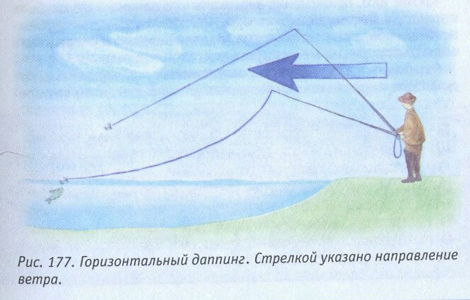 Здравствуйте, уважаемые рыболовы. Сегодня мы рассмотрим незамысловатый, но эффективный способ ловли, как горизонтальный даппинг. Горизонтальный даппинг используется, если на месте рыбалки вас встретил сильный ветер. Данный тип ловли лучше всего совершать с легкими удилищами и такой же облегченной катушкой. В качестве насадки лучше всего использовать животные приманки. Весь смысл ловли заключается в том, чтобы использовать мешающий вам ветер в свою пользу. Подготовив удилище по указанным выше критериям, начинаем применять ветер с правильной техникой. Мы позволяем нашей наживке касаться поверхности воды, а удилищем и леской играем насадкой (поддергиваем удилищем наживку). Ветер сам будет подбрасывать вашу наживку вверх, тем самым имитируя насекомое, упавшее в воду, или паденку. Этот метод можно использовать как с лодки, так и с земли. Также можно использовать нахлыстовые удилища. В качестве наживки лучше всего использовать кузнечиков, майских жуков, мушек. Я лично пробовал этот способ