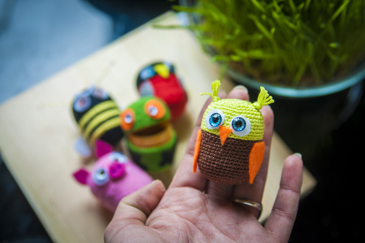 Смотрите, какое чудо мама моя связала для своей внучки! А я - сделала смешные мордашки, получилась отличная игрушка, а за одно и коробочки от киндеров пошли в дело. Все очень просто - обвязать тонкими ниточками (ирис) коробочки, подклеить "одежку" к пластику сверху и снизу. Главное - чтобы они открывались. Когда клей высохнет - можно приступать к оформлению мордашек. У вас в планах: лягушка, свинка, пчела, сова и снегирь. Сове делаем ушки из ниток, приклеиваем глазки, крылья и клюв из фетра. Лягушке делаем еще и лапки. Смотрите, какие они смешные с открытыми ртами))) Сова - моя любимица, а вот дочке больше всего пчела понравилась. Видимо, из-за усиков. Глазки я сделала из стеклянных кабошонов и бумажных подложек. Если вам интересно про глазки подробнее - можно прочитать тут. Спасибо за внимание! Хорошего настроения Вам и Вашим малышам!
