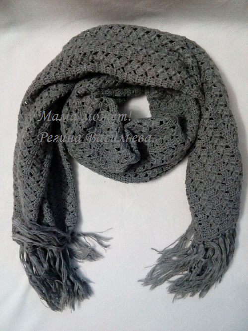 Здравствуйте.Связала зимой вот такой палантин,и хочу поделиться с вами,может кому понравится моё творение. Этот палантин мне безумно нравится.Его можно носить и зимой и летом.Зимой поверх куртки,а летом вечерами накинуть на плечи. Вяжется легко. Для вязания палантина подойдёт любая тонкая пряжа.Я использовала акриловые нитки,очень тонкие(так палантин смотрится нежнее).Ушло где-то 350 гр таких ниток,и оставшиеся 50 гр я использовала на кисти.Вместе кистей можно сделать обвязку.Крючок толщиной 1,5 мм.Ширина палантина 60 см,длина 170 см.Длину и ширину вы можете сделать любую. Описание. Крючком я связала цепочку из 186 воздушных петель. 1-ый ряд-3 петли подъёма,начиная с 5-й петли цепочки вяжем 5 столбиков с накидом над каждой петлей цепочки,* 1 воздушная петля,пропускаем 1 петлю цепочки,9 столбиков с накидом*.В конце ряда 6 столбиков с накидом. 2-ой ряд и все последующие ряды-3 петли подьема,2 столбика с накидом,* пропускаем 3 петли основания и под воздушную петлю предыдущего ряда провяз
