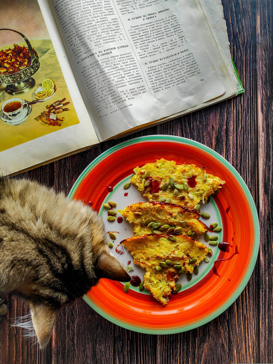 Доброго времени суток ! Очередной рецепт из "Книги о вкусной и здоровой пище", который я не много изменил и кой чего добавил- например кедровый сироп и тыквенные семечки на 2 порции нам потребовалось Кабачков-250гр , Яблоки -150гр , молоко 1.5%- 50гр , Масло сливочное-15гр, 2 яичных белка и 2 желтка , 10 гр сахара , 5 гр ванильного сахара , 30гр манной крупы , сметаны 60гр, немного кедрового сиропа и тыквенных семечек. Кабачки я чистить не стал , натёр на тёрке и тушил с молоком и маслом до полуготовности , затем добавил нечищенные и не кислые(важно) натёртые яблоки и тушил ещё пять минут , после добавил манную крупу и на 10 минут убрал с плиты чтобы охладилось- это очень важно, ведь потом я добавил желток и взбитый белок , всё хорошенько перемешал, выложил в керамическую форму смазанную маслом , посыпал немного сахаром и запёк в духовке Когда сахар покоричневел-блюдо готово, подал со сметаной кедровым сиропом и тыквенными семками , кошке понравилось , а это знаете ли главный крите