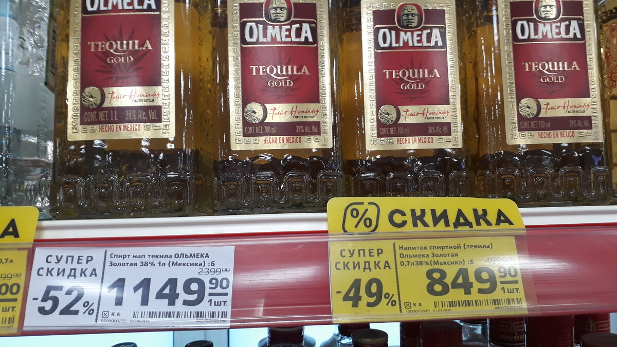 Здравствуйте, дорогие друзья!!! Универсамы сети Магнит, вдруг оживились по поводу текилы. На ценниках появились скидки 47-53%. Хорошие цены для любителей мексиканской Агавы. Знаменитая на весь мир текила Olmeca(Ольмека) Gold. 1149 рублей - отличная цена за литр этого напитка. 849 рублей за 0,7 тоже очень хорошо. Литр белой текилы Olmeca Blanco за 1049 рублей, просто отлично по сегодняшним ценам. Регулярные цены на Ольмеку давну пересекли отметку две тысячи. Tequila Sombrero Resposado - переходная текила между белой невыдержанной Silver и выдержанной Anejo. Респосадо тоже должна быть выдержана несколько месяцев. В составе есть какая-то добавка, что-то типа экстракта дуба. Возможно добавляется вместо выдержки в дубовых бочках, а может быть в дополнение. 459 рублей - супер-цена за неё! В отличии от многих распространённых текил, дистиллят для Сомбреро производится из кактуса Агава на 100% и не смешивается потом с более дешёвыми. В другом магазине. Младшая сестра, предыдущей текилы - Sombr