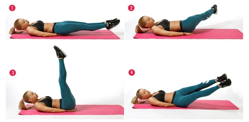 Махи полукругом Инструкция : 1) Устроившись на полу, вытяните носочки. 2) Сведя ноги вместе, начните рисовать в воздухе полукруг, уводя носочки влево. 3) Поднимите ноги вверх. 4) Поверните носочки направо. Повторите действия, проводя черту полукругом в обратную сторону (направо, вверх, налево). Мостик с прогибом Инструкция: 1) Примите исходное положение: стойка на цыпочках, упор на ладони, ягодицы максимально высоко. 2) Прогнувшись в пояснице, начните медленно опускать торс вниз. 3) Продолжайте опускаться на полусогнутых локтях, пока не коснетесь грудью пола. 4) Опустившись, выпрямите локти и поднимите верхнюю часть торса, сильно прогнувшись в талии. Отжимания с гантелями Инструкция: 1) Примите исходное положение для отжиманий: спину ровно, упор на носки, ладони в «замке» на гантелях. 2) Отожмитесь от пола, выпрямив локти. Затем согните одну руку, поднимая гантель (вторая рука на полу). 3) Примите исходное положение и снова отожмитесь от пола. 4) На этот раз согните проти