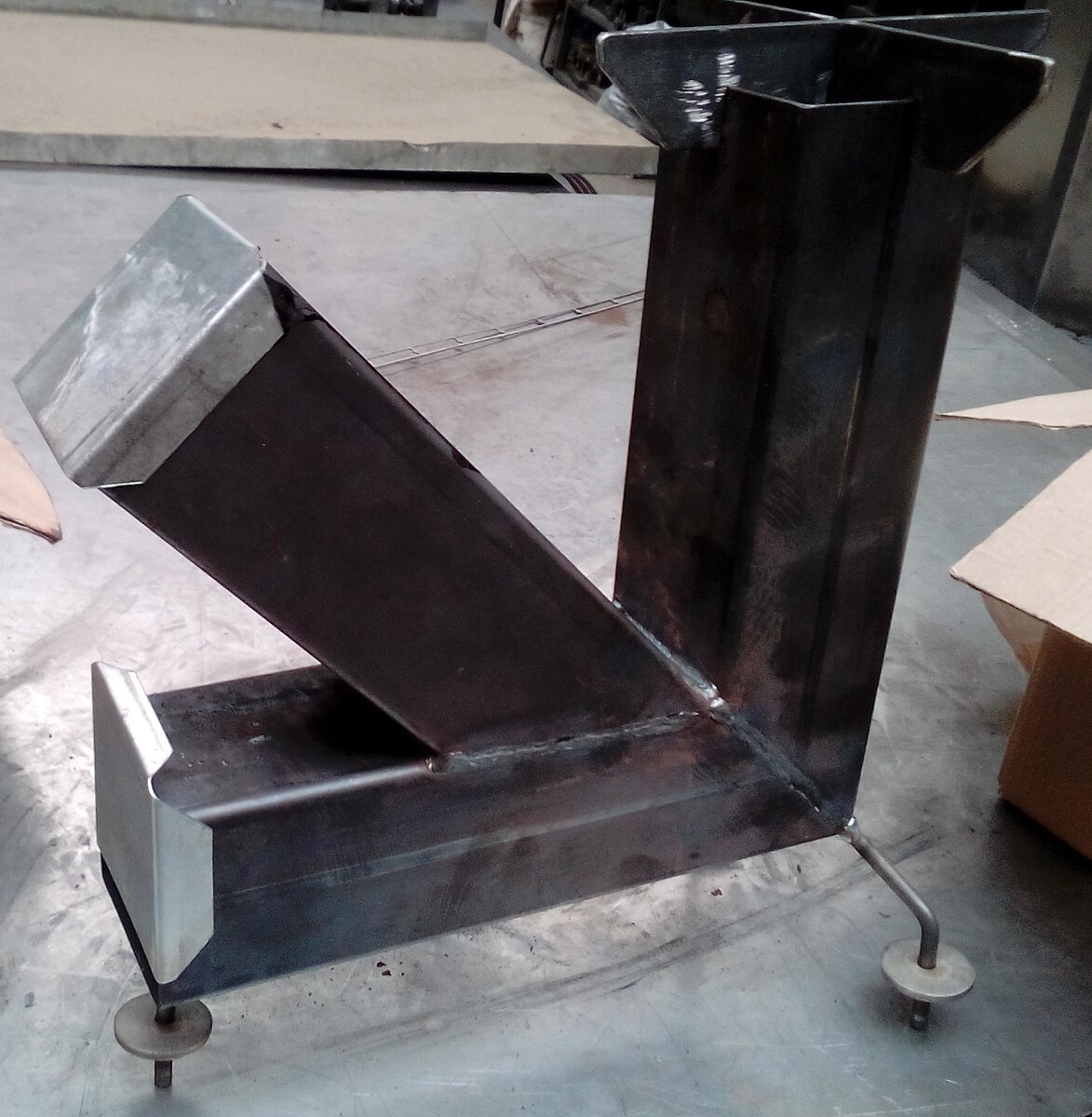 На выходных решили сделать ракетную печку для рыбалки. Дело в том, что каждой весной вводится запрет на разведение костров. У нас основная рыбацкая база находится на острове, но и там могут штрафануть запросто. Юридически запрет распространяется на всю территорию, а аргументировать тем, что мы окружены водой смысла нет. Инспектора нынче с логикой не дружат. Предварительно обсуждая конструкцию столкнулись с вопросом: в какой зоне должны находится дрова во время топки? Решили проверить экспериментально. Нашлись обрезки профильных труб 80х80 длиной около 300 мм. из которых сварили такую конструкцию: Крышки на дровяной отсек и на поддувало сделали из обычной оцинковки 0,5 мм. Пружинящие загибы крышки крепко держат и при необходимости легко снимаются. В городе как раз шла санитарная вырубка веток березы, там и набрали веток на дровишки. В дровяной отсек загрузили ветки и с поддувала газеткой легко зажгли печку. Печка разгорелась довольно быстро и появился характерный рев пламени. Крышкой