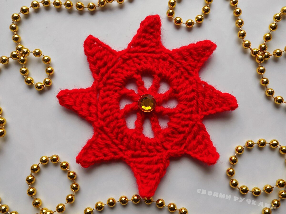 Украшать свой дом к Новому году можно не только снежинками и новогодними игрушками. Для рукодельниц предоставляется возможность выполнить некоторые детали декора с помощью крючка и пряжи. Например, можно связать рождественские звездочки, представленные в этом мастер-классе. Фото 1. Для вязания такой звездочки мы приготовили:
