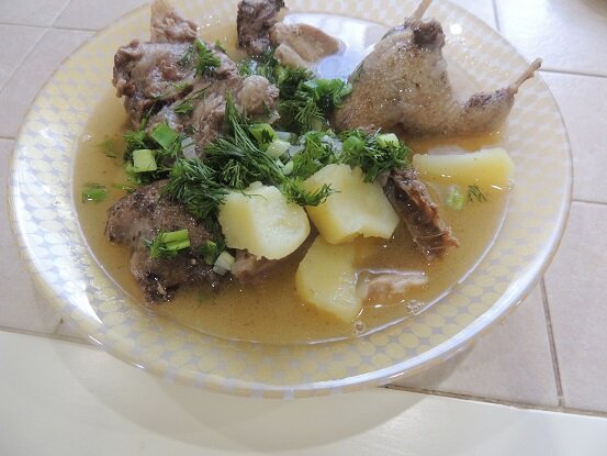 Шурпа из дичи с картофелем очень вкусное и сытное блюдо охотников. Открытие весенней охоты прошло удачно для моего главного Дегустатора. Вчера он отличился и принес мне две маленькие птички под названием вальдшнеп. Вальдшнеп – по окрасу напоминает куропатку, по размеру голубя, а по клюву немного похож на дятла. Шурпа – наваристый, густой суп, где большую часть блюда составляет мясо. Традиционно шурпу из дичи готовят на костре, на природе. Вкуснотища неописуемая. Конечно, чтобы приготовить шурпу совсем недостаточно иметь 2 птички. Во-первых, дичь диетический продукт, с нее мало бывает навара. А во-вторых, объем двух птиц хватит только на один зубок здорового мужчины. Чтобы выйти из этой ситуации, я решила добавить в шурпу свинины. Получилось очень вкусно. Для приготовления понадобится : Дичь необходимо ощипать, опалить и распотрошить. Постоянные читатели знают, что этим неблагодарным делом занимается исключительно мой главный дегустатор. Птицу разрезаем на несколько частей. Свинину