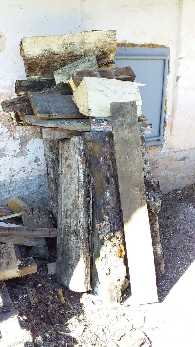 Дрова для дровяной бани распилены и наколоты, но не сложены.