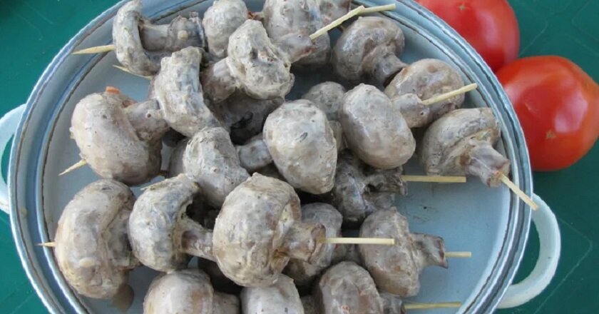 Все привыкли готовить на мангале шашлыки из мяса, но не менее вкусными будут и шампиньоны, приготовленные на шампурах. Грибной шашлык Для шашлыка выбирают плотные грибочки со шляпкой не более 5 см. Жарить грибы можно на металлических шампурах или деревянных шпажках. Нанизав грибы на шпажки, их обжаривают на углях со всех сторон. Солят и перчат уже зажаренными. Шампиньоны в сметане Предварительно надо обжарить лук до золотистого цвета. Каждый гриб хорошо обмазать сметаной. Жарить грибы надо 15 минут, после чего снять с шампуров и соединить с жареным луком. Шампиньоны в майонезе 100 граммов соуса смешать со специфическими итальянскими травами, посолить, поперчить и перемешать грибы в маринаде, и через час довести их до готовности на раскалённых углях. Шампиньоны с салом Отделите шляпки грибов от ножек и в каждую шляпку аккуратно поместите кусочек сала. Перед этим замаринуйте грибы в подсолнечном масле, добавьте перца и винный уксус. Грибы аккуратно нанизывают на шампуры и отправля