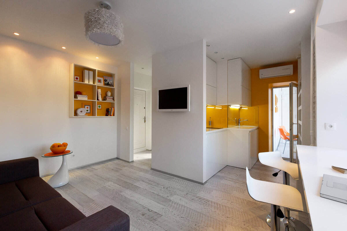 Однокомнатная квартира площадью 22 квадратных метра в центре Киева, Украина – яркий пример компактного многофункционального дизайна от студии Fateeva Design. Здесь удалось организовать полноценное, технически оснащенное жилье для посуточной аренды и не выйти за рамки очень скромного бюджета. Полностью перепланировав квартиру, автор проекта Елена Фатеева привнесла в нее еще больше света и тепла за счет расширения окон, разворотов откосов, и введя дополнительный яркий акцент - сочный, жизнерадостный желтый цвет стен и аксессуаров. В интерьере нашлось место и для рабочего уголка - подоконника с консольной конструкцией, который так же стал местом для приема пищи, для зоны отдыха на балконе, и для полноценного хранения вещей, и для удобной ванной комнаты, санузел максимально расширили в два раза и уместили там душевую, умывальник и консольный унитаз (над последним удалось еще сделать небольшую систему хранения). Источник Источник
