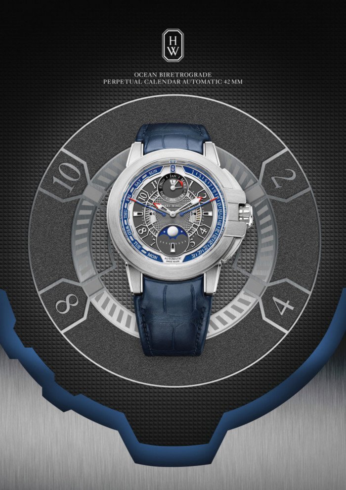 В этом году коллекция часов Ocean компании Harry Winston отмечает свое 20-летие. Чтобы отметить это событие известный производитель ювелирных изделий и часов уже представил публике новые модели семейства Ocean. Коллекция пополнилась моделью Ocean Biretrograde Perpetual Calendar Automatic 42mm, архитектурно и геометрически современным хронометром, оснащенным двойным ретроградным вечным календарем, разделенным по уровням и отличающимся по деталям и текстурам. Эта модель демонстрирует свежий подход к часам с вечным календарем. В ней индикация разнесена по зонам, отличающимся по цвету и расположенным на разных уровнях. Классическая сложность в этой модели соединена со спортивным стилем, отличающим коллекцию Harry Winston и предлагает пользователю индикацию даты, времени, високосного года и фазы луны. Дни недели и дата отображаются ретроградным механизмом. Стрелка, показывающая день, поднимается, тогда как остальные – опускаются. Когда они достигают конца своих ретроградных счетчиков, то