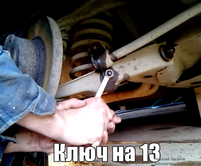 Итак, в прошлой статье мы рассмотрели как снять передний амортизатор, теперь перейдем к снятию пружины и рычагов. Для этого, нам понадобятся: Также нагружаем подвеску, подставив опору под ступицу или нижний рычаг, чтобы снять напряжение в болтовых соединениях. Предварительно все соединения зачищаем и обрабатываем "жидким ключом". Для начала, ключами "на 22" ослабляем гайки крепления верхнего и нижнего рычагов. Затем ключом "на 13" отворачиваем скобу крепления стабилизатора и снимаем резиновую подушку. Откручивать надо осторожно, так как гайки со временем "закисают" и шпильки могут обломиться, что, в общем, и произошло. Теперь, необходимо сорвать пальцы верхней и нижней опоры с посадочного места. Для этого вывешиваем подвеску, давая расслабиться пружине, отворачиваем гайки пальцев до конца резьбы, не снимая окончательно. Резкими ударами молотка по ушку поворотного кулака добиваемся выхода пальца из посадочного места. Если так не получается, то воспользуемся специальным съемником или с