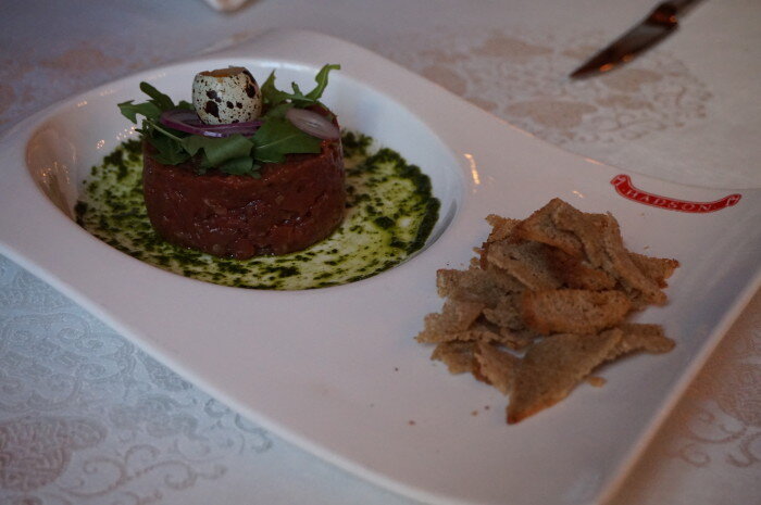 - Тар-тар из говядины по классическому рецепту с фирменным соусом от шеф-повара.