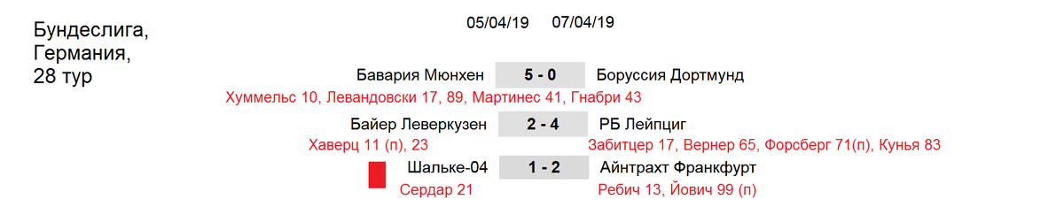 в чемпионате Германии прошел 28 тур. В нём встретились лидеры – лучшие клубы Бундеслиги. Бавария громит Боруссию 5-0. Это победа стала для хозяев поля восьмой подряд в чемпионате. Напомню, в прошлом сезоне, также в 28 туре, мюнхенцы выиграли и вовсе 6-0. Левандовски записал дубль. Роберт стал первым легионером, которому удалось преодолеть отметку в 200 мячей в Бундеслиге, 74 за Боруссию и 126 за Баварию. Обычно после таких унизительных поражений тренер уходит в отставку. В первом круге счет был 3-2 в пользу дортмундцев. Смотрите как много забивают в Германии, Лейпциг на выезде одолел Байер 4-2. За фармацевтов Хаверц провел 2 гола, но его клубу это не помогло. Байер терпет 3 проигрыш подряд. Шальке не удержало ничью в поединке с Айнтрахтом. На 99 минуте пенальти реализовал Йович и сократил отставание от Левандовски. Автор мяча гельзеркирхенцев Сердар на 95 минуте был удален. 3 месяца «орлы» не уступают во всех турнирах. В этом туре ещё был поединок со счетом 5-0. Расписание.