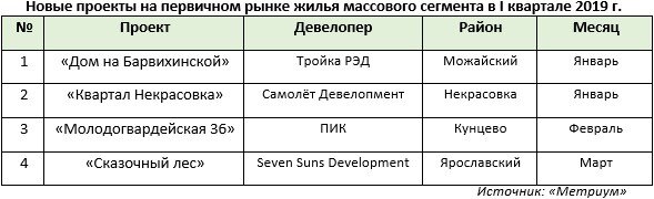 По итогам I квартала 2019 года на первичном рынке столичного жилья массового сегмента было представлено 85 жилых комплексов. Объем предложения составил 16 760 лотов площадью 973 тыс. кв. метров. За прошедший квартал было объявлено о начале реализации четырёх проектов, сообщает компания «Метриум». Появление на рынке новых проектов и корпусов привело к увеличению количества продаваемых квартир на 11,8%. Общая реализуемая площадь выросла на 8,8%. Старт продаж новых домов произошел в следующих жилых комплексах: По подсчетам аналитиков, в конце I квартала 2019 года средневзвешенная цена квартир массового сегмента на рынке новостроек Москвы составила 165,7 тыс. рублей за кв. метр. Это на 0,1% выше среднего ценового уровня прошлого месяца и на 2,2% больше показателя декабря 2018 года. К концу марта 2019 года средний бюджет квартиры массового сегмента составил 9,62 млн рублей (−0,5% к декабрю 2018 года). Снижение обусловлено сокращением среднего размера квартир. При этом в разрезе типологий бю