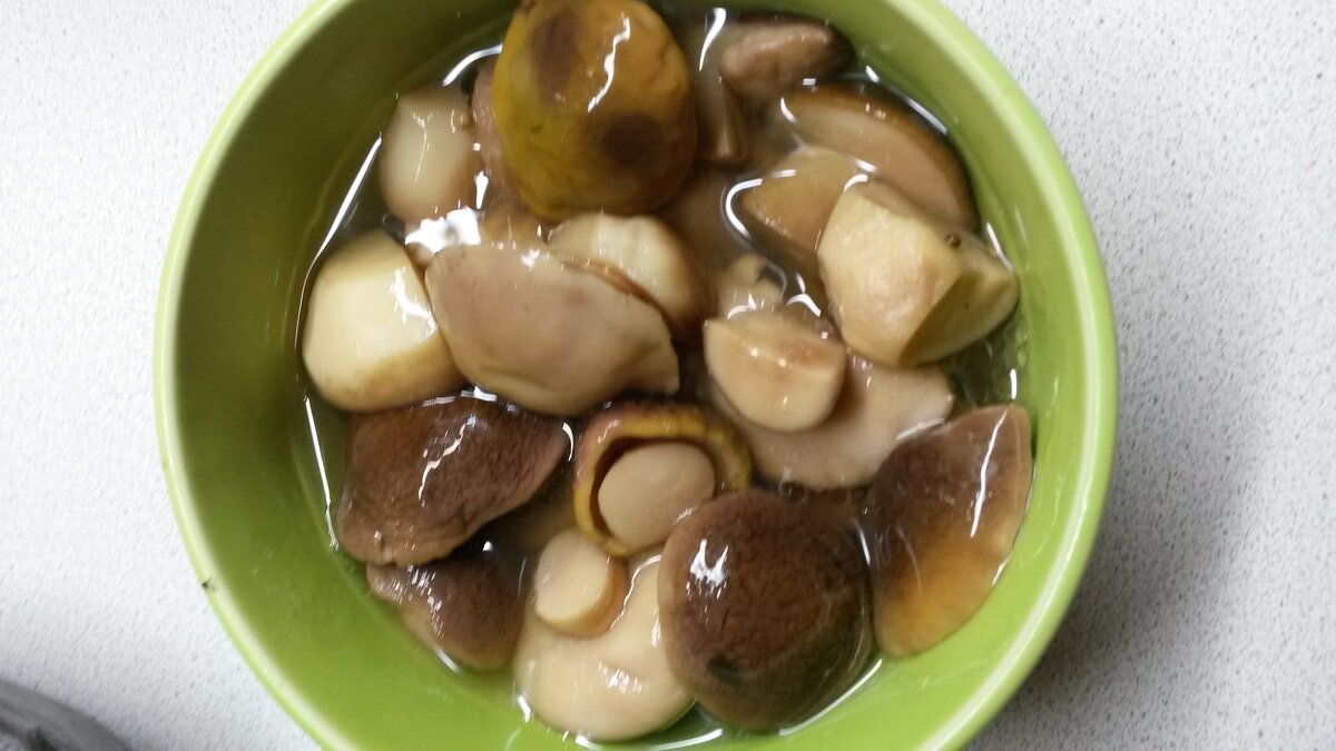 - 1/2 ч. ложки 70% уксусной эссенции. При варке грибов соблюдаем пропорцию: на каждый килограмм боровиков нужен стакан воды а соли — 2 ст. ложки без верха. Подготовленные боровики проварим пару минут при сильном кипении воды. Грибы отцедим и промоем в проточной воде, зальем водой заново по норме, положим соль, варим около часа. Пену с отвара собираем обязательно. Банки подвергаем стерилизации и в горячие раскладываем ошпаренную кипятком зелень и пряности. Выкладываем грибы, кипящий маринад льем прямо в банку, куда уже добавлена уксусная эссенция. Банки, прикрытые крышками ставим, на стерилизацию в кастрюлю с водой. Кладем на дно мягкую тряпочку или полотенце, иначе стекло может треснуть и продукт будет испорчен. Для полулитровых баночек достаточно тридцатиминутной стерилизации, для литровых времени понадобится в два раза больше. Герметично укупоренные консервы нужно перевернуть и хорошенько закутать, пока не остынут. Чтобы маринованные боровики хорошо хранились и не принесли вреда здоровью нужно соблюдать некоторые условия.