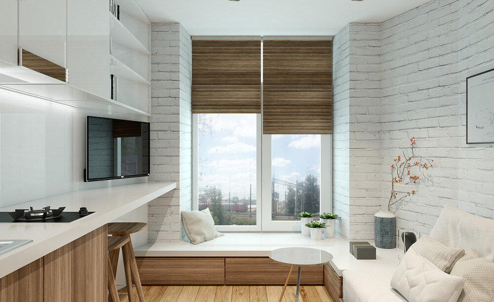 Помещение для временного проживания семейной пары находится на чердаке над лестницей в доме дореволюционной постройки. Чтобы уместить всё необходимое, архитектуры бюро Lofting придумали мебель-конструктор, которая опоясывает всю комнату. В супертесном пространстве решили использовать только два цвета – белый и натуральное дерево. Кирпичные стены оказались достаточно хороши, чтобы покрасить их и оставить на виду. Наиболее проблематично было найти место для хранения вещей. Поэтому в стене справа от дивана спрятали шкаф, который выкатывается в проход. Такое решение позволило не оставлять место для открывания дверец. Мебель сделали на заказ, чтобы встроить её без зазоров по всему периметру комнаты. тумбочки плавно перетекают в раскладной диван-кровать, затем в подоконник-комод. Он низкий, поэтому там удобно отдыхать или смотреть телевизор. Вдоль всей стены напротив расположили кухонный гарнитур. Нижнюю его часть освободили, чтобы получился своеобразный стол, а в верхней предусмотрели
