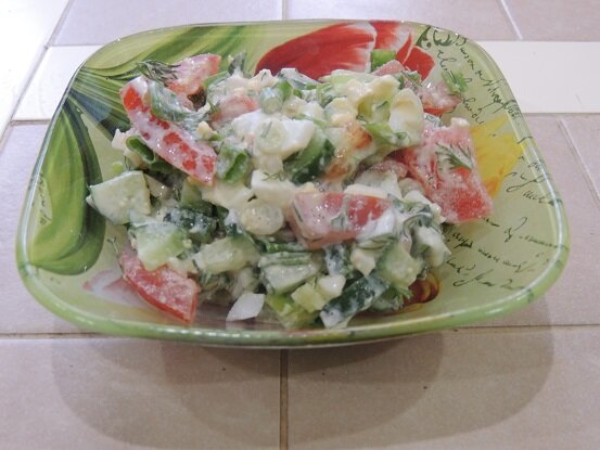 Давненько в моем маленьком кулинарном блоге не было вкусных и простых салатов. Срочно спешу исправить эту ситуацию. Представляю вашему вниманию весенний салат из овощей и зелени. На улице весна, еще совсем немного и мы с главным Дегустатором откроем велосипедный сезон. Уже 3й год, как мы практически каждый летний вечер проезжаем минимум 10 км. За прошлое лето даже побили свой рекорд и проехали более 500 км. Но это уже другая история, вернемся к нашему салату. Весна, такое яркое солнышко, что уже не хочется оливье или винегрета. Организм желает много зелени, витаминов и все в этом роде. Так как на выходные мои маленькие непоседы уходят жить к бабушке, то ингредиенты я брала из расчета нас двоих. Для приготовления понадобится: Куриные яйца промываем, отвариваем вкрутую. Для этого понадобится 10 минут времени. Очищаем, нарезаем на маленькие кусочки. Отправляем в салатник. У огурца пробуем шкурку, важно чтобы она не горчила, в таком случае огурец необходимо очистить. Нарезаем огурчик на