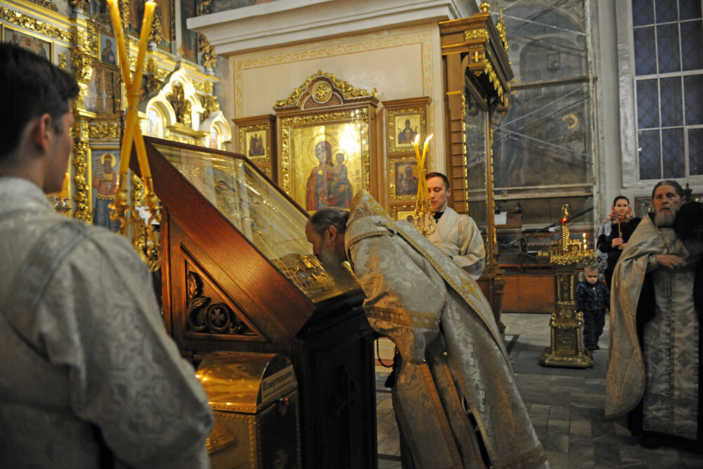 В четверг, 28 марта 2019 года, в Трифоновом монастыре города Кирова состоялась торжественная встреча иконы святителя Феодосия Черниговского, утраченный оклад которой был возвращен Покровскому храму города Советска в мае 2018 года и до настоящего времени находился на реставрации. - Усилиями правоохранительных органов святыня была возвращена, а после нашлись благотворители и те, кто сумел своим трудом восстановить утраченную икону святителя Феодосия Черниговского и вновь передать ее в лоно Церкви, - рассказали Вятской Епархии. История возвращения на родную землю этой иконы напоминает настоящий детектив. В 2014 году в заброшенном помещении Тульской полиции был найден почерневший от времени большой металлический предмет, завернутый в старую ткань. Когда находку отмыли от грязи, полицейские не поверили глазам - в полный рост из металла выступил образ святого. Была проведена искусствоведческая экспертиза. Она показала, что оклад имеет большую историческую и культурную ценность.