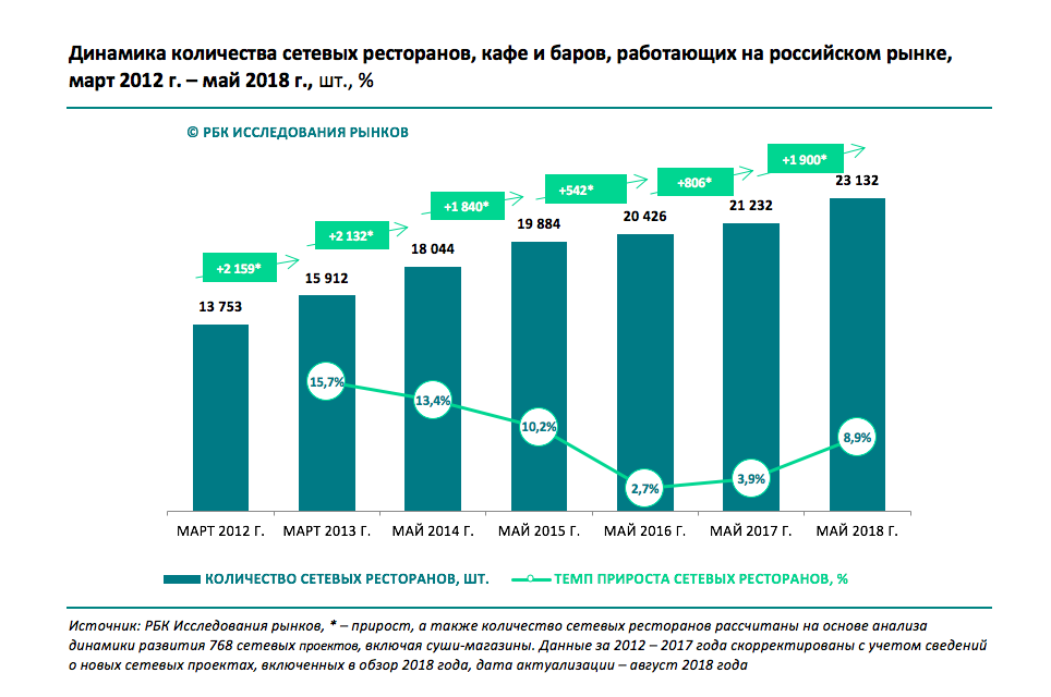 Кроме того, люди стали меньше рисковать: они предпочитают уже знакомые места экспериментам. Осторожность при выборе ресторанов усиливает позиции успешных сетевых проектов. Для них прошедший год стал периодом количественного и качественного роста. За май 2017 года – май 2018 года число сетевых ресторанов выросло почти на 9%, что уже сопоставимо с темпом экспансии докризисных 2013-2014 годов.