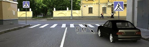 И так, водитель поставил автомобиль на стоянку перед пешеходным переходом. Как показано на рисунке расстояние от автомобиля до края проезжей части 5 метров. Как говорят правила, остановка запрещена, если расстояние менее 5 метров до края дороги, но в нашем случае есть еще пешеходный переход. А согласно п.п. 12.4, расстояние между пешеходным переходом и автомобилем должно быть не менее 5 метров.