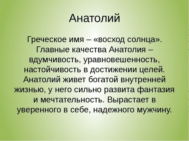 Анатолий Анатолий — восточный (древнегреческое). Анатолией греки называли Малую Азию, находившуюся на востоке от Греции. Имя никогда не забывалось и сейчас вполне распространено. Основные черты: хорошая интуиция, эмоциональность. Отчество: Анатольевич, Анатольевна. Зодиак имени: Телец. Планета: Луна. Цвет имени: желтый. Камень-талисман: агат. Благоприятное растение: фиговое дерево, фиалка. Покровитель имени: ягуар. Счастливый день: пятница. Счастливое время года: весна. Именины, святые покровители Анатолий Константинопольский, патриарх, 16 (3) июля. Анатолий Никийский, мученик, 3 декабря (20 ноября). С двумя братьями был казнен в Никее в 312 г. Анатолий Печерский, затворник, в Ближних (Антониевских) пещерах, 16 (3) июля, И октября (28 сентября). Анатолий Печерский, затворник, в Дальних (Феодосиевских) пещерах, 16 (3) июля, 10 сентября (28 августа). Анатолий Никомидийский, мученик, 6 мая (23 апреля). При виде страданий святого великомученика Георгия уверовал во Христа и был убит в 30